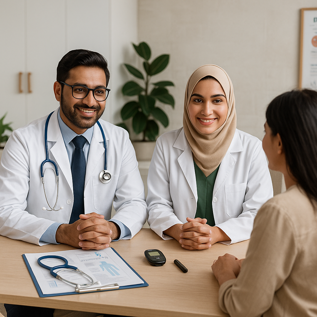 Endocrine & Diabetes Care in Lahore Led by FRCP London Specialist If you’re searching for the best endocrinologist for diabetes treatment in Lahore, you likely want two things: proven medical expertise and clear, compassionate care that helps you stay healthy long term. At Prime Health Hub – DEW (PHH-DEW) in DHA Phase 6, Lahore, we deliver both led by Dr. Ali Raza Naqvi, FRCP London, a UK-trained consultant endocrinologist with 20+ years of experience, specialist MRCP/CCT training from London, and 17+ peer-reviewed publications. He is currently Consultant Physician & Endocrinologist at PKLI Research Center, Lahore (since Oct 2022) and a GMC-recognized clinical & educational supervisor. This guide explains how we diagnose, treat, and prevent complications of type 1, type 2, and gestational diabetes, what makes our treatment approach different, and why Dr. Naqvi’s international credentials directly translate into safer care and better outcomes for patients across DHA, Gulberg, Model Town, and Johar Town and even for those comparing options in Karachi or Islamabad. By the end, you’ll know exactly what to do next to take control of your diabetes and how to book a same-day or next-day consult at PHH-DEW. Book Your Consultation: +92 329 990 7779 | Online appointment (PHH-DEW Contact) | Visit us in DHA Phase 6, Lahore (Google Maps) Why Choose Diabetes Treatment in Lahore at PHH-DEW? Choosing diabetes care in Lahore shouldn’t mean compromising on standards. At PHH-DEW, we align our protocols with ADA (American Diabetes Association) Standards of Care 2025 and NICE (UK) guidance, then tailor them to the Pakistani healthcare context. Diabetes Journals Evidence-based care: Medication and lifestyle plans are built from the latest ADA/NICE guidance (e.g., when to use SGLT2 inhibitors or GLP-1 receptor agonists for heart and kidney protection in type 2 diabetes). Diabetes Journals Integrated services: On-site diagnostics, medication counseling, complication screening, and weight-management support so you avoid fragmented care. Continuity & follow-up: Clear targets, regular reviews, and proactive complication screening to keep you on track. Dr. Naqvi’s International Expertise Dr. Ali Raza Naqvi, FRCP London trained and practiced across top UK hospitals for 15+ years including Imperial Healthcare NHS Trust, London (Specialist Registrar 2013–2018) before returning to Pakistan in 2022. His trajectory includes Portsmouth Hospital NHS Trust, Glasgow Royal Infirmary, Wrexham Maelor, Trafford General (Manchester), UK consultant posts (2018–2022), and recently with PKLI RC, Lahore. This history ensures you receive UK-standard endocrine care, adapted to local realities and access. Advanced Treatment Protocols PHH-DEW follows ADA 2025 and NICE NG28 algorithms to personalize therapy: starting with lifestyle and metformin (when appropriate), then SGLT2 inhibitors and GLP-1 RAs where indicated for cardio-renal benefits, and insulin when needed with modern devices and injection education to reduce hypoglycemia risk. Diabetes Journals Comprehensive Diabetes Overview Understanding Diabetes in Simple Terms Diabetes is a condition where glucose (sugar) builds up in your blood because your body does not make enough insulin or can’t use it properly. Over time, high glucose damages blood vessels and nerves, leading to complications in the heart, kidneys, eyes, and feet. Diagnosis relies on tests such as A1c, fasting plasma glucose (FPG), oral glucose tolerance test (OGTT), and random glucose. The ADA and NIDDK provide clear thresholds for each test. NIDDK A1c ≥ 6.5% (on a certified test) suggests diabetes; 5.7–6.4% indicates prediabetes. Diabetes.org FPG ≥ 126 mg/dL or a 2-hour OGTT ≥ 200 mg/dL also meet diabetes criteria. NIDDK Latest Treatment Approaches (2025) Modern diabetes care goes beyond “sugar control.” For type 2 diabetes, the ADA 2025 and NICE NG28 emphasize cardiovascular-renal protection when choosing medications: SGLT2 inhibitors (e.g., empagliflozin class) help reduce heart failure hospitalization and slow kidney disease progression. GLP-1 receptor agonists support weight loss and reduce major adverse cardiovascular events in high-risk patients. Diabetes Journals For type 1 diabetes, structured education, appropriate insulin regimens, and continuous monitoring (CGM/flash) are standard of care. For gestational diabetes, timing of diagnosis and treatment protects both mother and baby. All are covered comprehensively in ADA 2025. Diabetes Professionals Prevention Strategies You Can Start Today Maintain a healthy weight; even 5–7% loss improves insulin sensitivity. Aim for 150 minutes/week of moderate activity (e.g., brisk walking). Choose a low-GI, fiber-rich diet and keep portions consistent. Get regular screening for prediabetes if you’re at risk (family history, overweight, PCOS, prior GDM). Guidance: ADA 2025, NIDDK. Diabetes Professionals Explore our services: Diabetes Care at PHH-DEW | Weight Management Expert Treatment at PHH-DEW Clinic Diagnostic Capabilities At PHH-DEW (DHA Phase 6), we provide or coordinate: Laboratory testing: A1c, FPG, OGTT, lipid profile, kidney function, urine albumin-creatinine ratio. Thyroid & adrenal panels when relevant (autoimmunity is common alongside type 1 diabetes). Complication screening: retinal (ophthalmology referral), neuropathy assessment, foot checks, and cardiovascular risk stratification aligned with ADA/NICE intervals. Diabetes Professionals+1 Treatment Options Available Lifestyle & Medical Nutrition Therapy (MNT): culturally attuned meal plans for Lahore’s cuisine. Pharmacotherapy: Metformin where appropriate. SGLT2 inhibitors and GLP-1 RAs for eligible patients (especially with heart/kidney risks). Insulin therapy when required, with patient-friendly teaching to improve safety and confidence. Technology support: glucose meters, flash/CGM guidance, and data-driven dose adjustments. Weight-management integration: combining MNT,